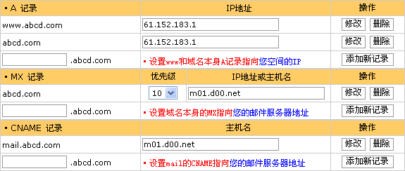 假设您的域名为:abcd.com 假设您的空间IP地址为:61.152.183.1 假设您的邮件服务器为:m01.d00.net