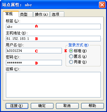 C.在“用户名(U)”栏中输入我们提供的FTP帐号用户名,如:h0101234