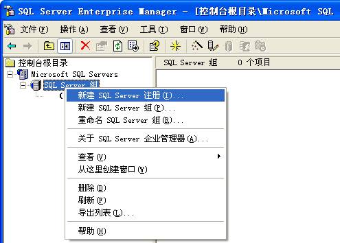 3。右键点SQL Server 组 --> 新建SQL Server 注册 -->下一步