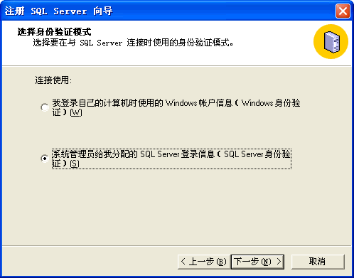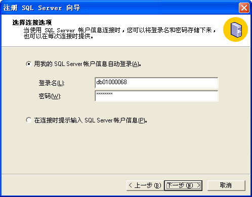 5。选择系统管理员给我分配的 SQL Server 登录信息(SQL Server身份验证),再点下一步